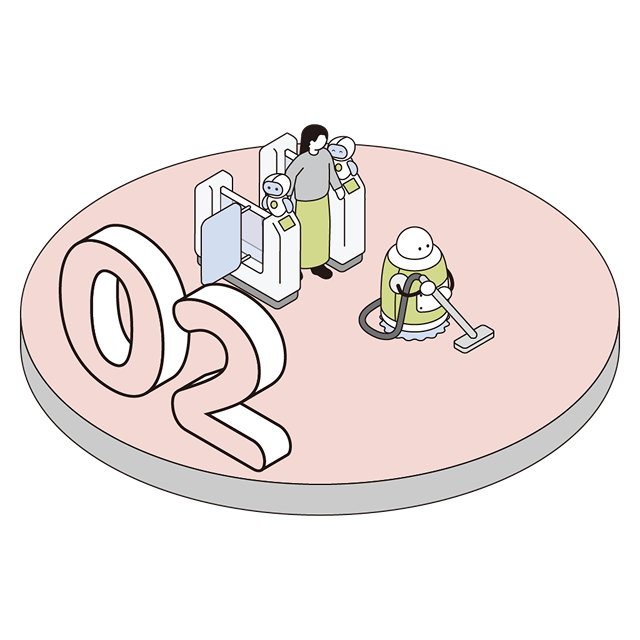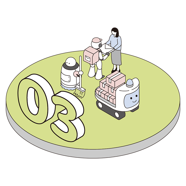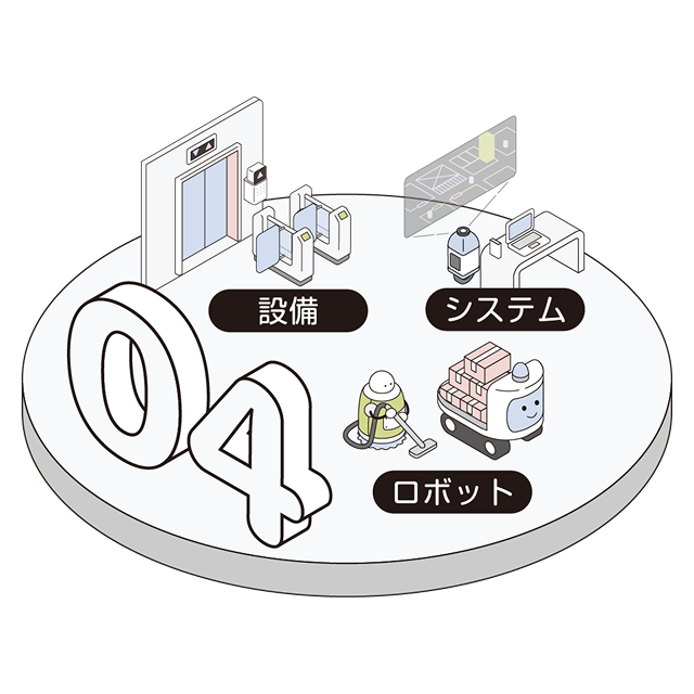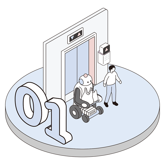 現在は、ロボットがエレベーターに人と一緒に乗ったり、セキュリティがかかった扉を上手に通ることが難しいです。私たちは、5つの項目からなる【ロボットフレンドリービルディングデザイン】のコンセプトをもとに、建物を設計する時からロボットの使い方を考えてデザインすることで、ロボットが働きやすい建物を作ります。